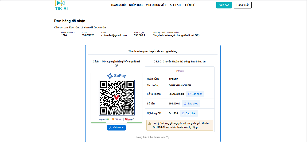 Ngay sau khi thanh toán mua khóa học trực tuyến,
